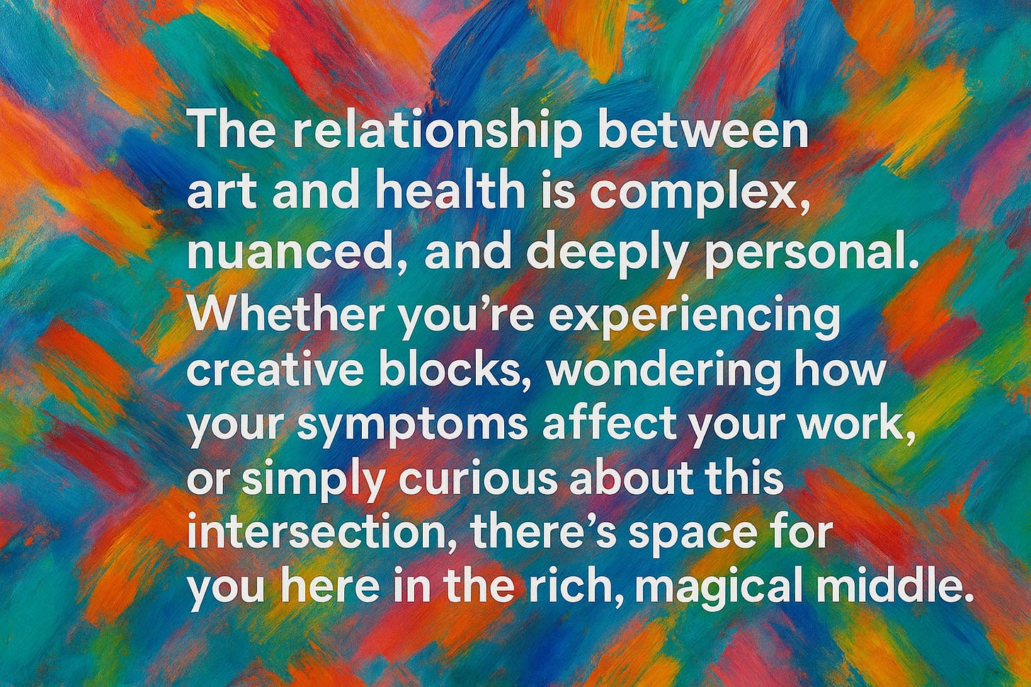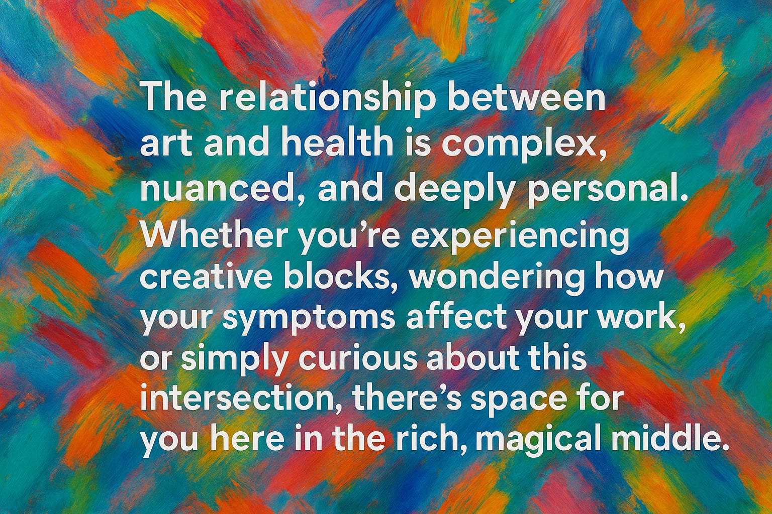 The Create Me Free Substack provides written explorations of all of the different aspects of how art meets health including in my own life, the lives of contemporary artists, art history, and across disciplines. I provide insights, exercises, ideas, narratives and myriad ways of looking at this complex relationship.